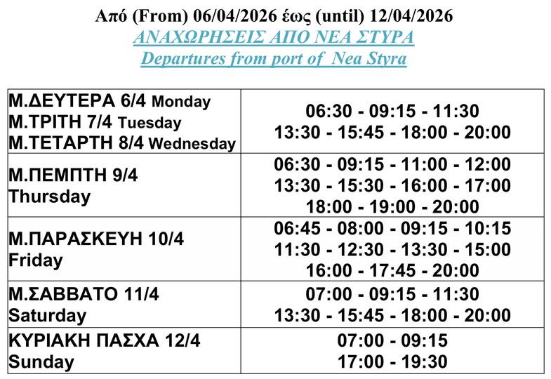 Η Μεγάλη Εβδομάδα που προβλέπεται με αίθριο καιρό είναι βέβαιο ότι θα προσελκύσει στην Καρυστία πολλούς επισκέπτες . Το πρόγραμμα των αναχωρήσεων από τα Νέα Στύρα είναι το ακόλουθο.
