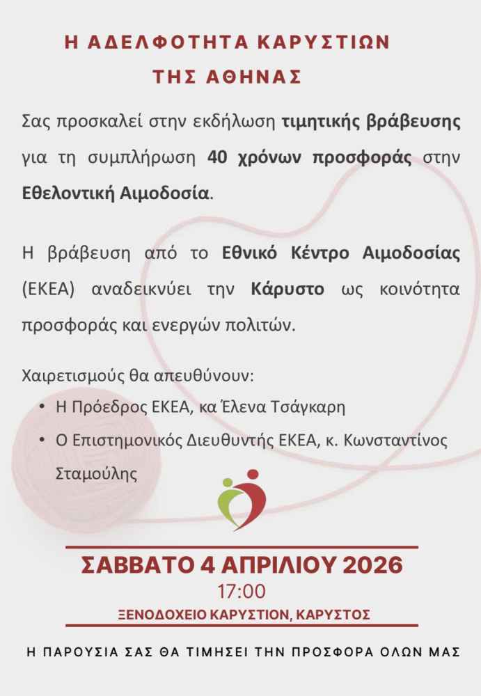 Η εκδήλωση θα πραγματοποιηθεί το Σάββατο 4 Απριλίου 2026 και ώρα 17:00, στο ξενοδοχείο «Καρύστιον» στην Κάρυστο, με τη συμμετοχή εκπροσώπων του Εθνικού Κέντρου Αιμοδοσίας (ΕΚΕΑ).
