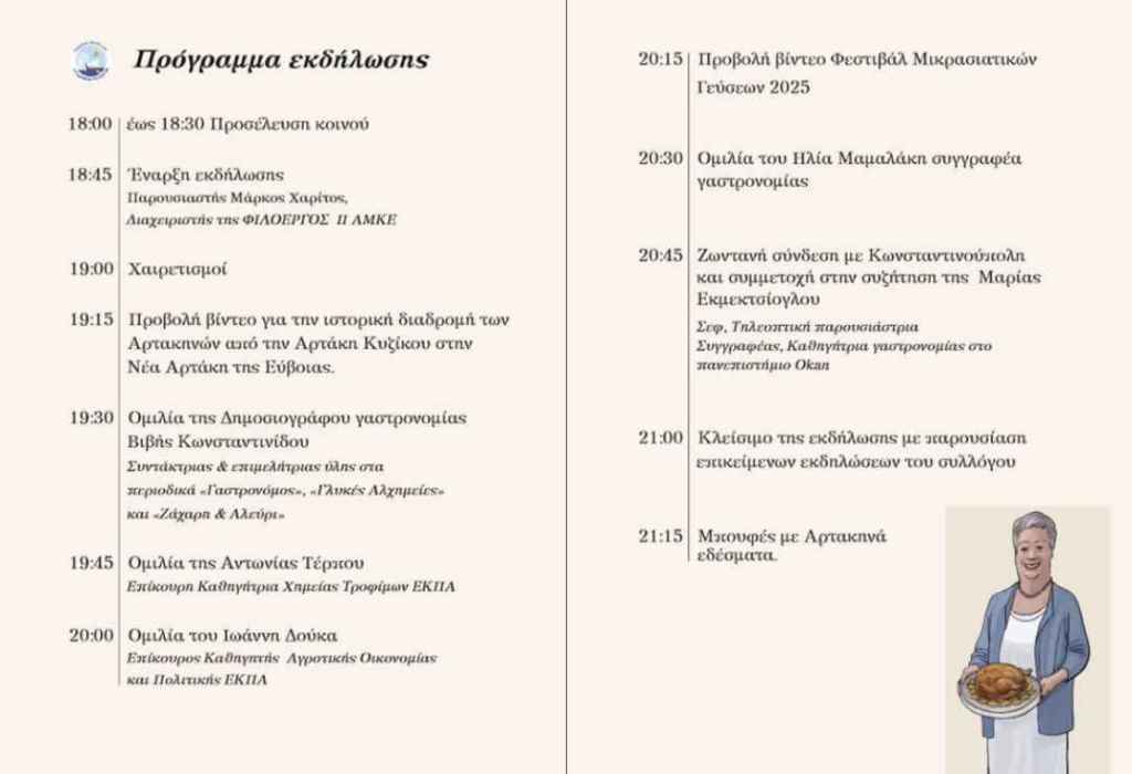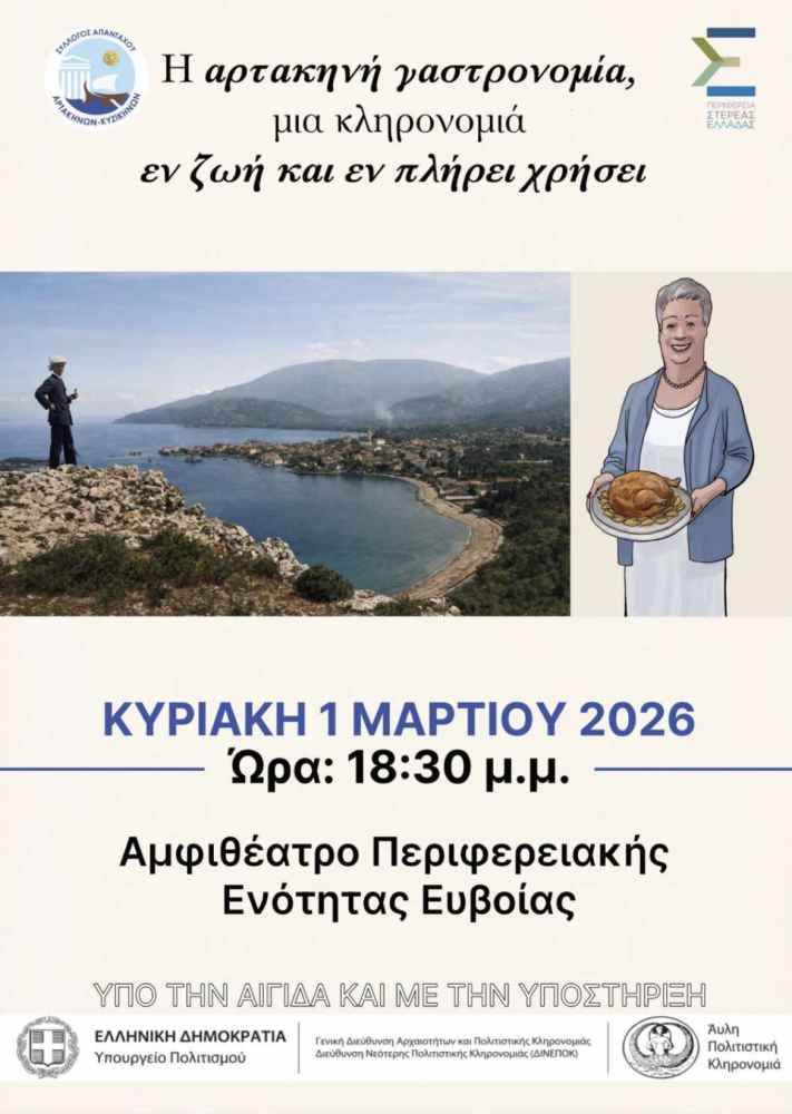 Εκδήλωση με θέμα «Η Αρτακηνή γαστρονομία, μία κληρονομιά εν ζωή και εν πλήρει γνώση» διοργανώνει ο Σύλλογος Απανταχού Αρτακηνών – Κυζικηνών, αναδεικνύοντας τη συμβολή της μικρασιατικής κουζίνας στην άυλη πολιτιστική κληρονομιά την Κυριακή 1 Μαρτίου 2026 και ώρα 18:30, στο αμφιθέατρο της Περιφερειακής Ενότητας Ευβοίας.