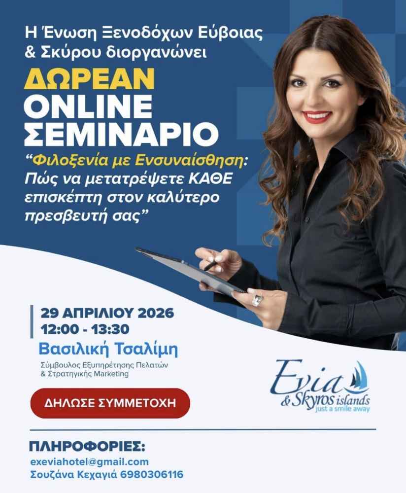 Η Ένωση Ξενοδόχων Εύβοιας & Σκύρου διοργανώνει ένα δωρεάν online σεμινάριο με τίτλο «Φιλοξενία με Ενσυναίσθηση: Πώς να μετατρέψετε κάθε επισκέπτη στον καλύτερο πρεσβευτή σας», με στόχο την ενίσχυση των δεξιοτήτων εξυπηρέτησης στον τουριστικό κλάδο.