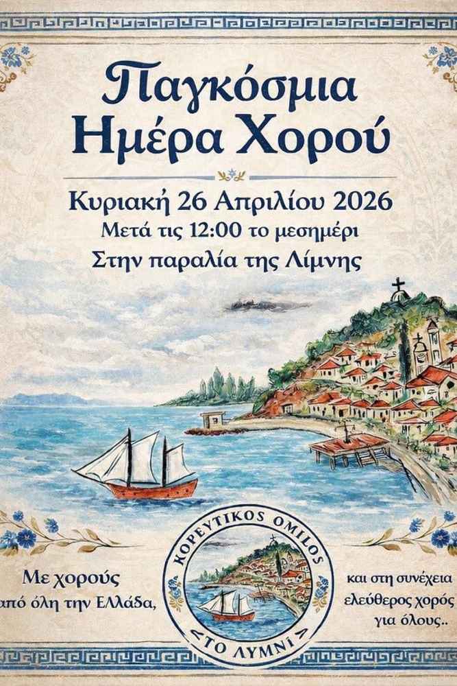 Με αφορμή την Παγκόσμια Ημέρα Χορού, διοργανώνεται μια ξεχωριστή εκδήλωση στη Λίμνη Ευβοίας, την Κυριακή 26 Απριλίου 2026, μετά τις 12 το μεσημέρι, στην παραλία.