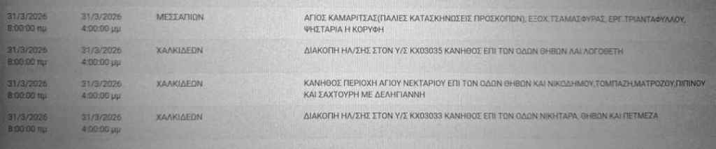 Προκειμένου να προγραμματίσετε τις εργασίες σας και να ελαχιστοποιηθεί η όχλησή σας, στον ακόλουθο πίνακα, μπορείτε να ενημερωθείτε για τις περιοχές και τις ώρες προγραμματισμένων διακοπών ηλεκτροδότησης στην Εύβοια την Τρίτη 31 Μαρτίου.