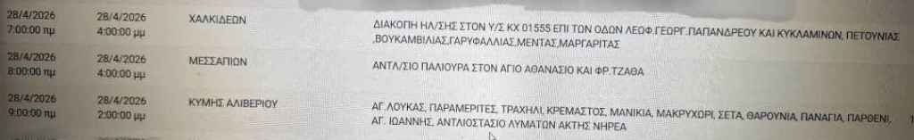>>> Εύβοια: Πολύωρη διακοπή ρεύματος σε περιοχές τριών Δήμων την Τρίτη 28/4