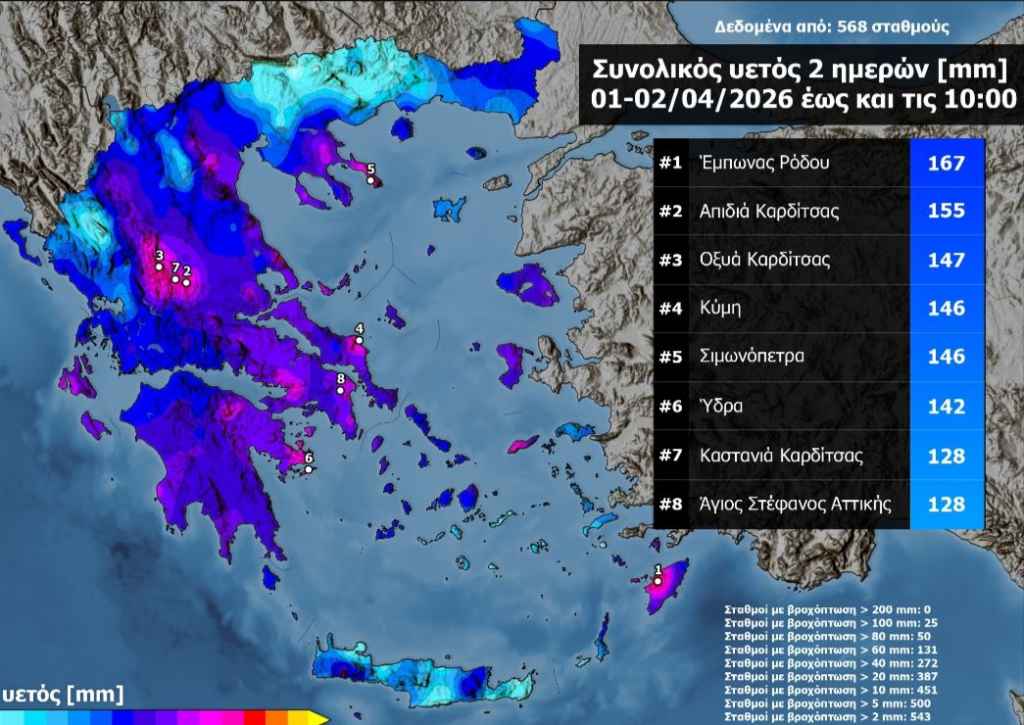 Εύβοια: Το σημείο με το πολύ υψηλό ύψος βροχής (146 mm) σύμφωνα με το Εθνικό Αστεροσκοπείο Αθηνών