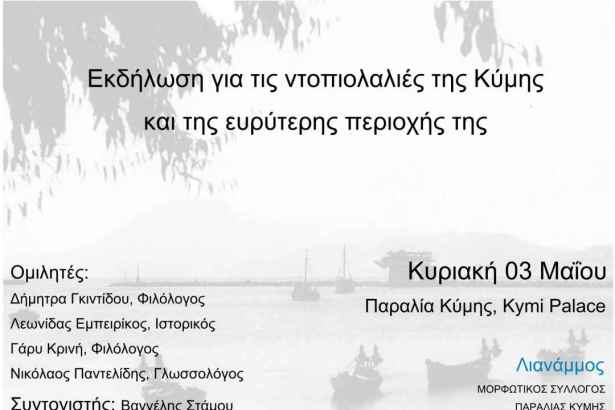 Κάλεσμα σε εθελοντές απευθύνει ο «Λιανάμμος», ενόψει εκδήλωσης που θα πραγματοποιηθεί την Κυριακή 3 Μαΐου, με θέμα τις ντοπιολαλιές της Κύμης και της ευρύτερης περιοχής.