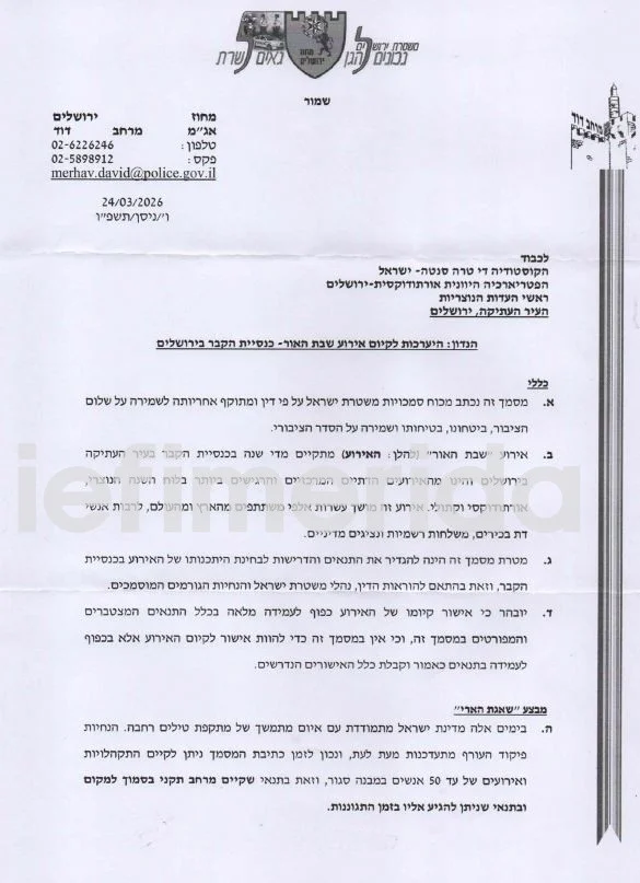 Η. Κατόπιν αξιολόγησης της κατάστασης που πραγματοποιήθηκε από την περιφερειακή διοίκηση στις 18/03/2026, και βάσει των εισηγήσεων των αρμόδιων επαγγελματικών φορέων της Αστυνομίας του Ισραήλ, αποφασίστηκε η επιβολή περιορισμών στη διεξαγωγή της Τελετής εντός του Ναού της Αναστάσεως.