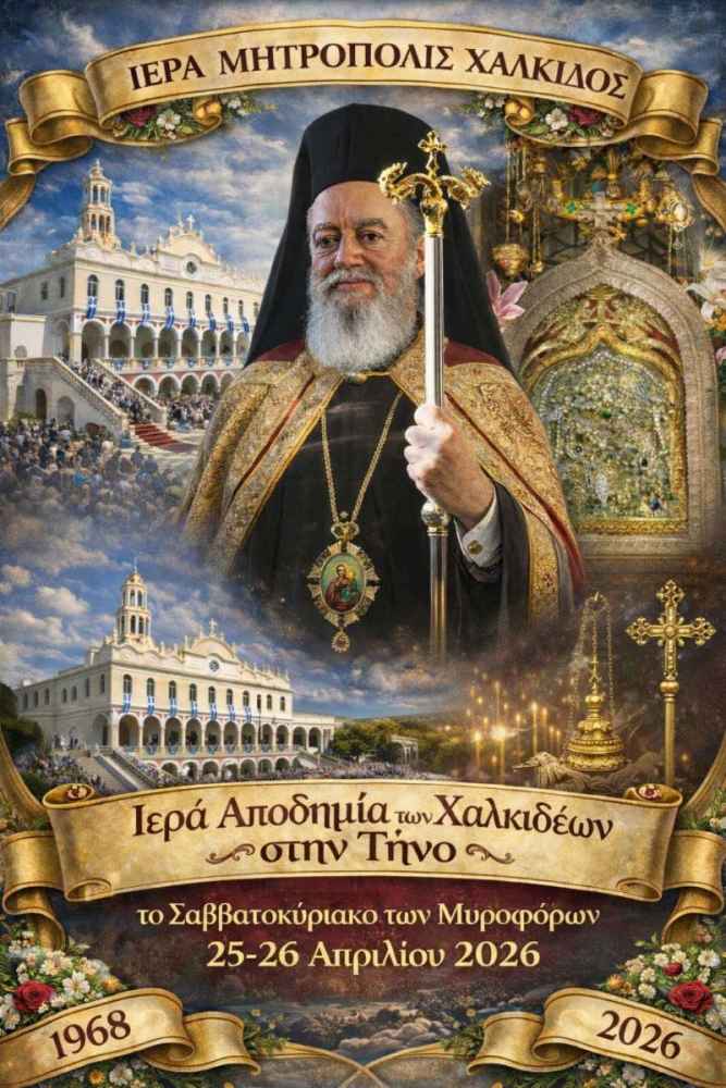 Το Σαββατοκύριακο 25 και 26 Απριλίου 2026, θα πραγματοποιηθεί υπό την αιγίδα του Σεβασμιωτάτου Ποιμενάρχου μας, Μητροπολίτου Χαλκίδος κ. Χρυσοστόμου, η από πεντηκονταετίας και πλέον καθιερωμένη από την αείμνηστο θεολόγο Ελένη Δεϊμέζη – Θεοχάρη, προσκυνηματική εκδρομή των Χαλκιδέων στην Ιερά Νήσο Τήνο.