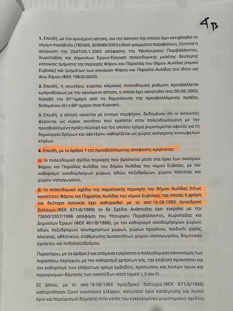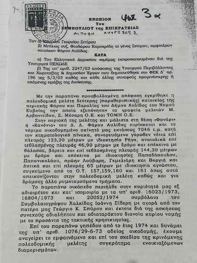 Ότι δηλαδή η καθυστέρηση εφαρμογής του σχεδίου παραθεριστικής κατοικίας στο παράκτιο μέτωπο της Αυλίδας, τάχα οφείλεται σε μία προσφυγή την οποία έχω ασκήσει εγώ κατά του Σχεδίου, διότι τάχα δεν επιθυμούσα την εφαρμογή του.