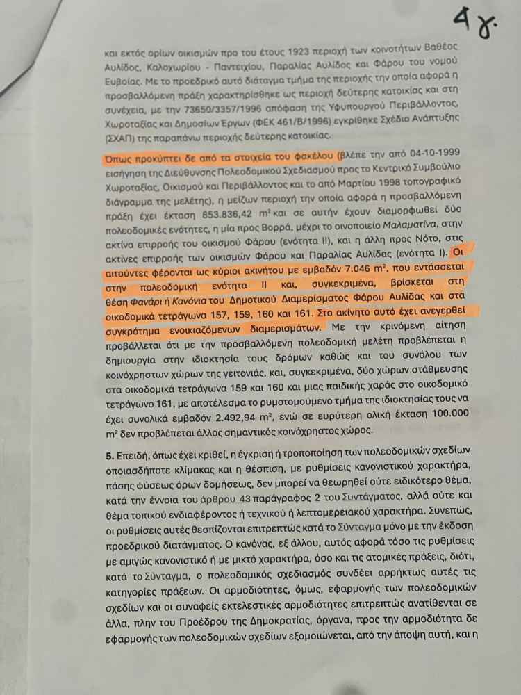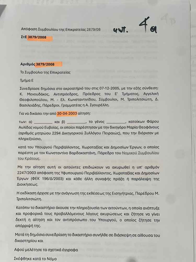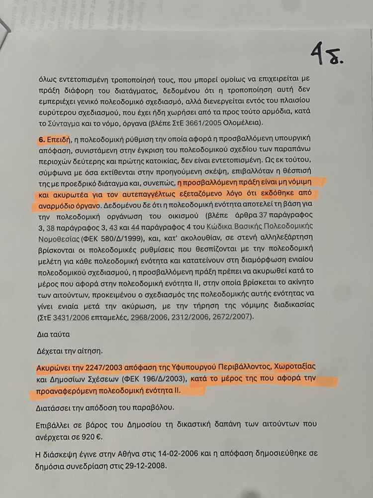 Το ΣτΕ με την απόφασή του όμως, δεν υπεισήλθε καθόλου στην ουσία του αιτήματός τους, γιατί έκρινε αυτεπάγγελτα και προδικαστικά ότι το ρυμοτομικό αυτό σχέδιο πάσχει ακυρότητα, καθώς θα έπρεπε να κυρωθεί με Προεδρικό διάταγμα και όχι με Υπουργική Απόφαση όπως εσφαλμένα είχε γίνει. (φωτ 4).