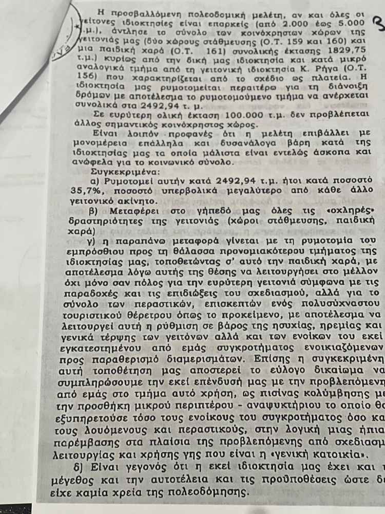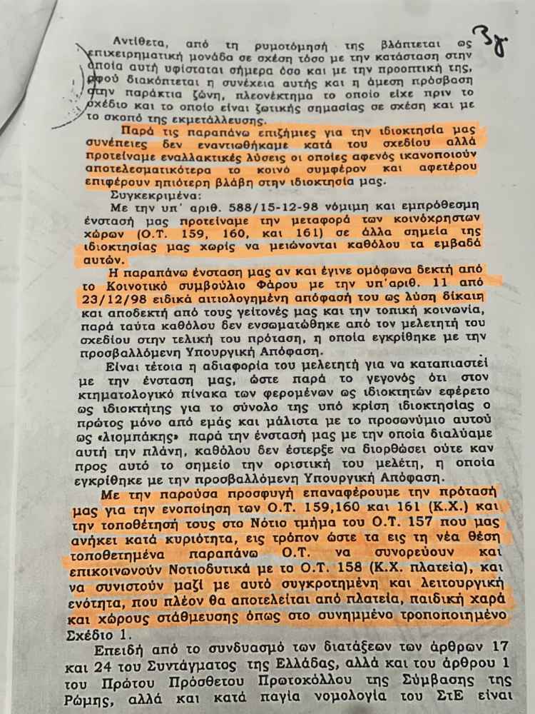 Δεν άσκησα εγώ προσωπικά ποτέ και καμιά προσφυγή κατά κανενός Σχεδίου. Άσκησαν όμως προσφυγή, όπως είχαν νόμιμο δικαίωμα, το έτος 2003, ο αείμνηστος πατέρας μου Κωνσταντίνος και η αδερφή του Μπίλια, ως αποκλειστικοί συνιδιοκτήτες ενός υπέρμετρα ρυμοτομούμενου από το Σχέδιο παραθαλάσσιου οικοπέδου, εκτάσεως 7 περίπου στρεμμάτων, πάνω στο οποίο είχαν χτίσει νόμιμα από τη δεκαετία του 1970 τριώροφο συγκρότημα επιπλωμένων διαμερισμάτων.