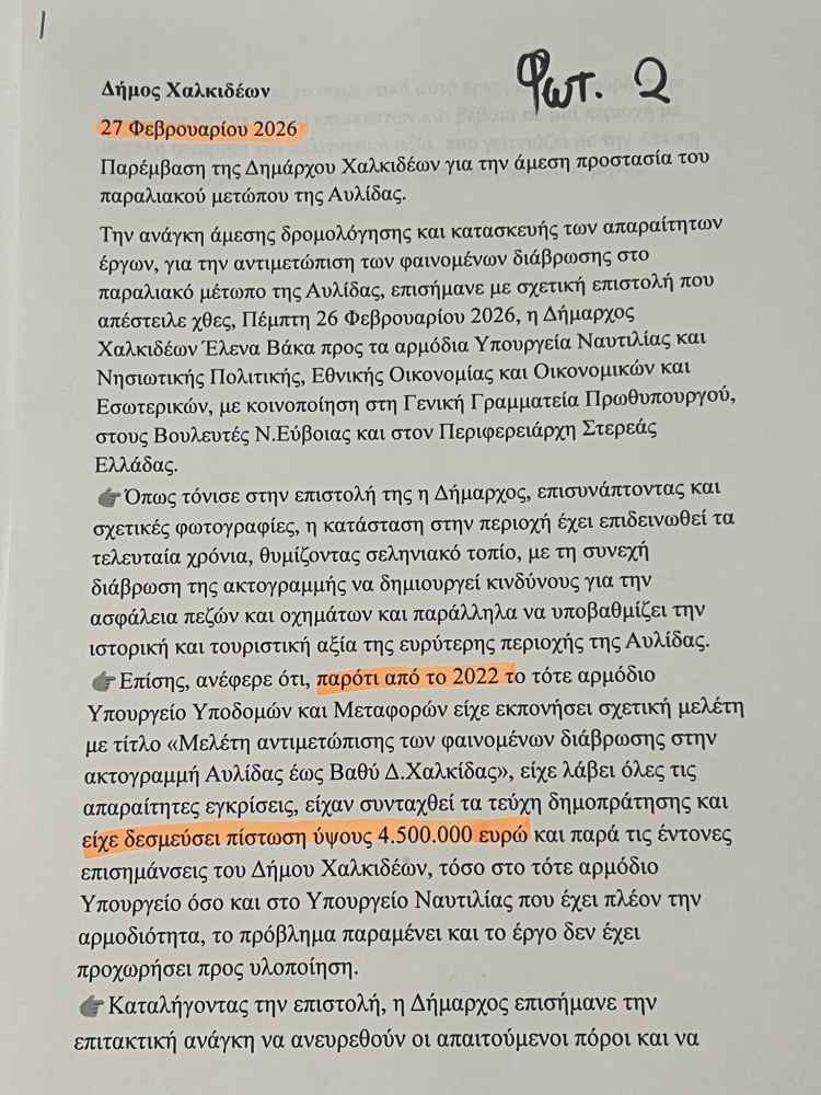 Ναι υπάρχει και το λέει ενσυνείδητα η δήμαρχος Έλενα Βάκα, η οποία στην από 26/2/2026 επιστολή της στα Υπουργεία Εμπορικής ναυτιλίας, Εθνικής Οικονομίας και Εσωτερικών (φωτ 2) και στο συναφές δελτίο τύπου, με μια θολή διατύπωση αποσιωπά ότι η δέσμευση του σχετικού κονδυλίου έγινε πολύ πριν το 2022, υπονοώντας ότι μπορεί να έγινε και επί των δικών της ημερών.