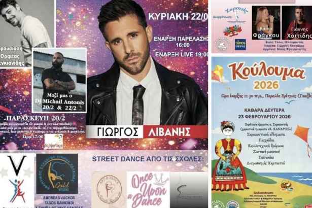 Η παρέλαση των καρναβαλιστών θα ξεκινήσει στις 4 το απόγευμα στην παραλία, με παρουσιαστή τον Ορφέα Γενκιανίδη. Στις 7 μ.μ. ακολουθεί δωρεάν συναυλία στην πλατεία με τον τραγουδιστή Γιώργο Λιβάνη.