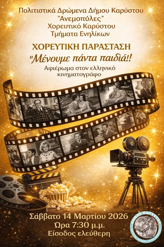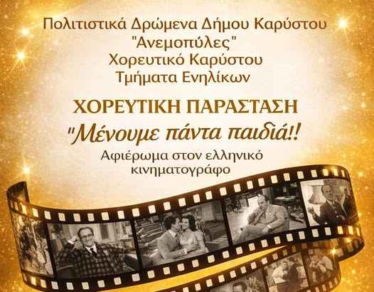 Το Χορευτικό Καρύστου (Τμήματα Ενηλίκων) και τα Πολιτιστικά Δρώμενα Δήμου Καρύστου «Ανεμοπύλες» σας προσκαλούν σε μια ξεχωριστή χορευτική παράσταση – αφιέρωμα στον ελληνικό κινηματογράφο!
