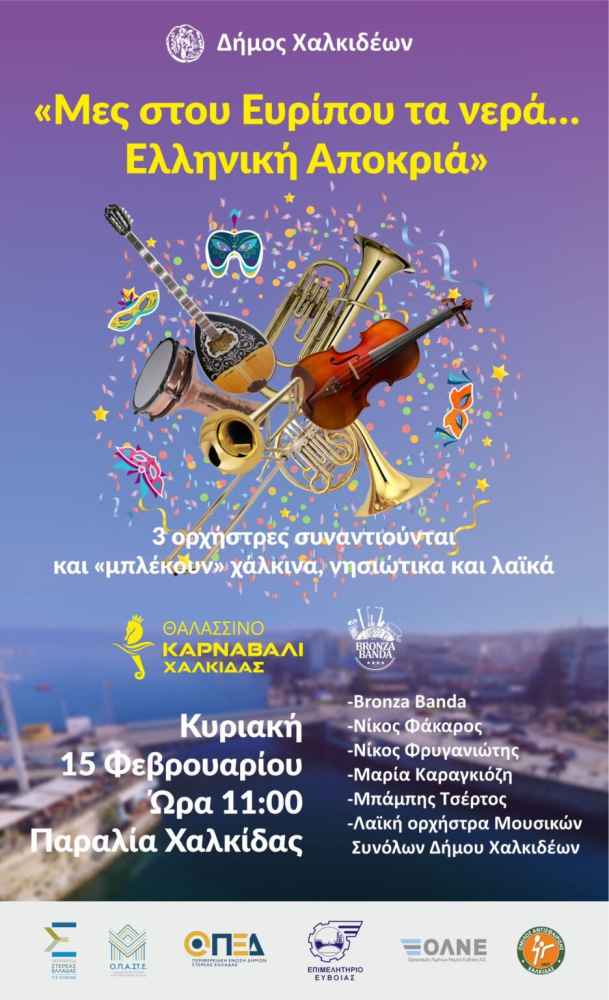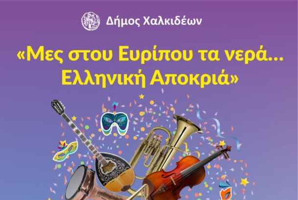 Η παραλία της Χαλκίδας γεμίζει μουσική, παράδοση και αποκριάτικο κέφι την Κυριακή 15 Φεβρουαρίου 2026, με την εκδήλωση «Μες στου Ευρίπου τα νερά… Ελληνική Αποκριά», που διοργανώνει ο Δήμος Χαλκιδέων στο πλαίσιο του Θαλασσινού Καρναβαλιού Χαλκίδας.