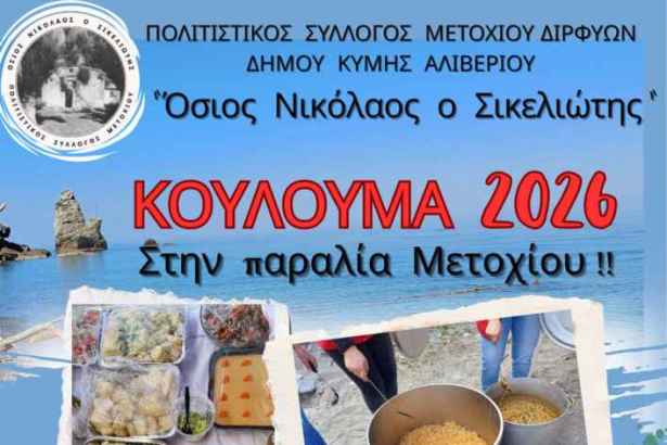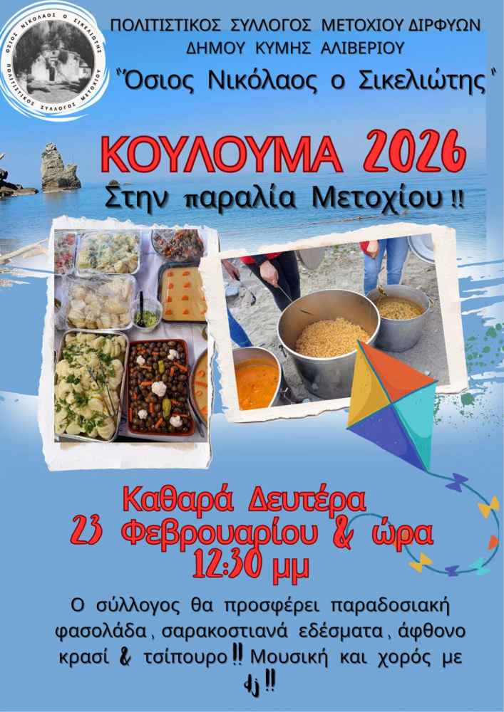 Στην παραλία Μετοχίου θα γιορταστούν και φέτος τα Κούλουμα, με τον Πολιτιστικό Σύλλογο Μετοχίου Διρφύων «Όσιος Νικόλαος ο Σικελιώτης» να απευθύνει ανοιχτό κάλεσμα σε κατοίκους και επισκέπτες για τον εορτασμό της Καθαράς Δευτέρας.