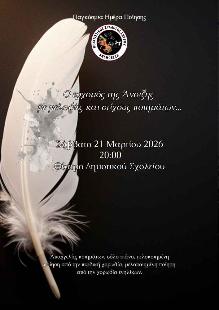 Ο Πολιτιστικός Σύλλογος Σκύρου “Ανεμόεσσα” διοργανώνει διήμερες εκδηλώσεις με το τμήμα Χορωδίας παραδοσιακής μουσικής, α) την Παρασκευή 20 Μαρτίου στις 20:30 με παραδοσιακά τραγούδια από όλη την Ελλάδα, και β) το Σάββατο 21 Μαρτίου στις 20:00, αφιερωμένη στην Παγκόσμια Ημέρα Ποίησης, με απαγγελίες ποιημάτων, σόλο πιάνο, μελοποιημένη ποίηση από την παιδική χορωδία, μελοποιημένη ποίηση από την χορωδία ενηλίκων.