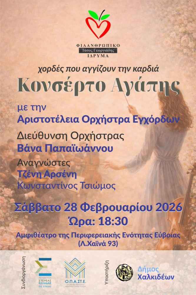 Το ξεχωριστό μουσικό γεγονός με έντονο φιλανθρωπικό αποτύπωμα θα πραγματοποιηθεί στην Χαλκίδα το Σάββατο 28 Φεβρουαρίου 2026 στις 18:30, στο Αμφιθέατρο της Περιφερειακής Ενότητας Εύβοιας (Λ. Χαϊνά 93), με την Αριστοτέλεια Ορχήστρα Εγχόρδων να υπόσχεται ένα μουσικό ταξίδι υψηλής αισθητικής.