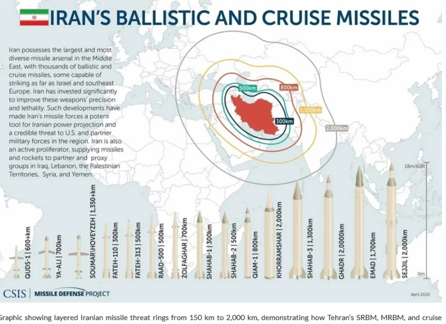 Στον παρακάτω πίνακα του Center for Strategic and International Studies, φαίνεται η εμβέλεια όλων των πυραύλων που κατέχει ο ιρανικός στρατός.