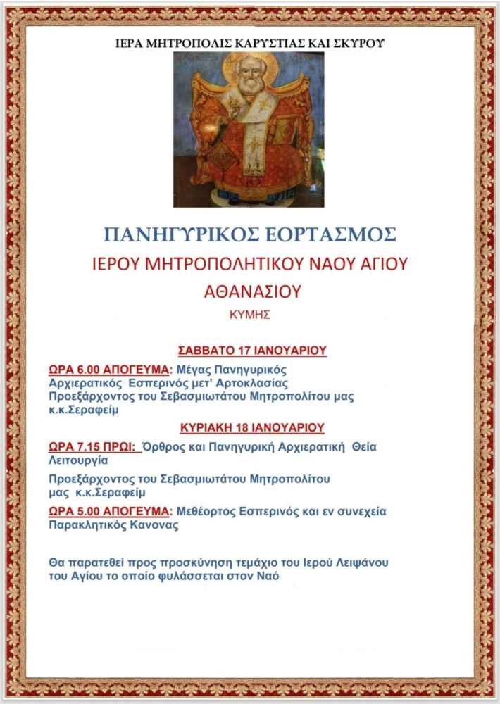 Με λαμπρότητα θα τιμηθεί και φέτος η μνήμη του Αγίου Αθανασίου στον Ιερό Μητροπολιτικό Ναό Κύμης, στο πλαίσιο διήμερων λατρευτικών εκδηλώσεων που διοργανώνει η Ιερά Μητρόπολη Καρυστίας και Σκύρου. Οι ακολουθίες θα τελεστούν το Σάββατο 17 και την Κυριακή 18 Ιανουαρίου, παρουσία του οικείου Ποιμενάρχη.