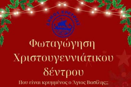 Ο Δήμος Ερέτριας διοργανώνει εκδήλωση για την φωταγώγηση του κεντρικού Χριστουγεννιάτικου Δένδρου,…